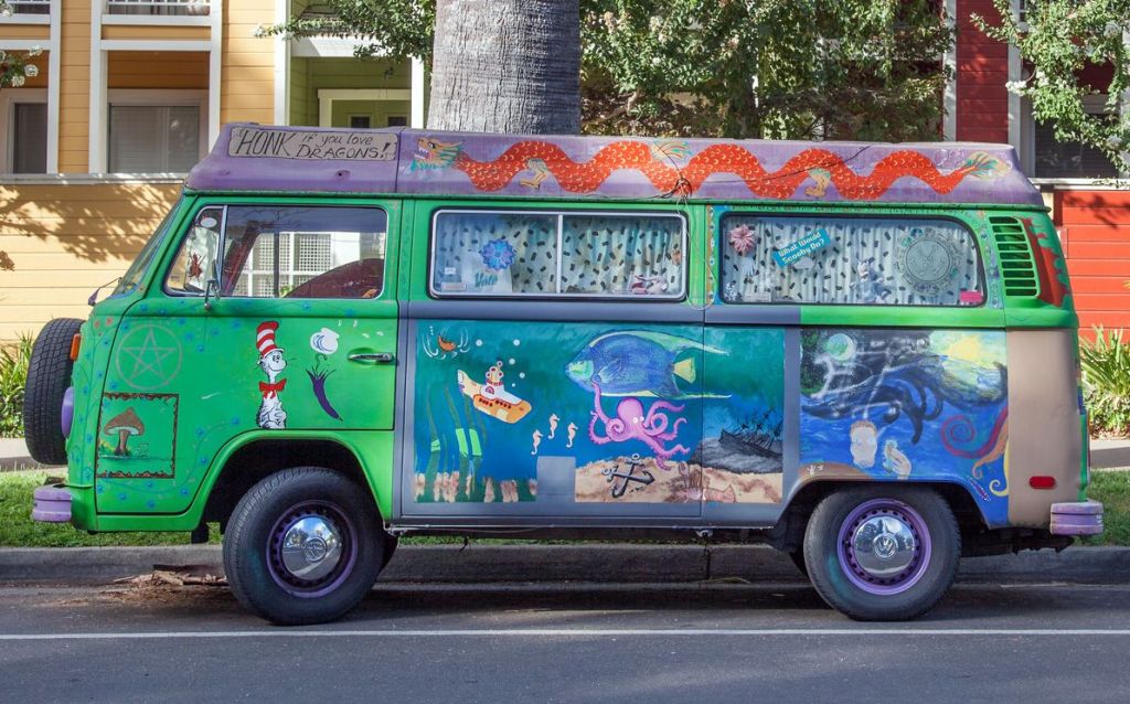 Nachdem beide ihre Einkäufe bezahlt hatten, die Effi die Hälfte ihres Budgets gekostet hatten, gingen sie zum Auto der Hippietante. Es war ein Bus. Ein riesiger bunter Wagen. Die Seitentür war aufgezogen. Davor standen eine Frau, zwei Männer, ein Mädchen, etwa 14 Jahre alt, und ein Junge im selben Alter.